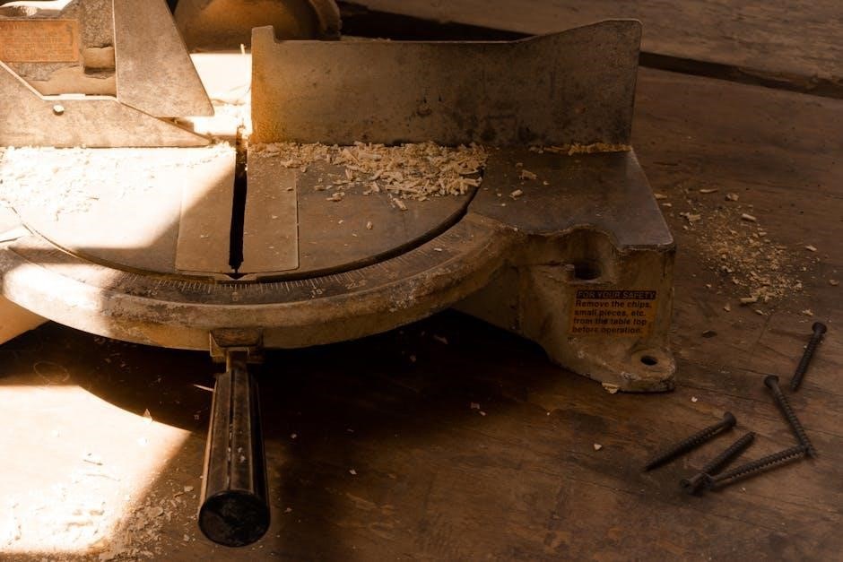 Regular cleaning of the saw and components ensures optimal performance․ Lubricate moving parts to maintain smooth operation․ Store the miter saw in a dry, secure location to prevent damage․